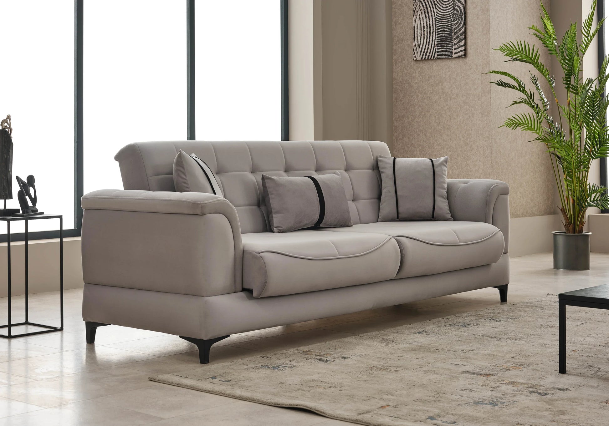 Offrez à votre intérieur un canapé qui mêle style et fonctionnalité. Le modèle DELTA en velours gris perle, au capitonnage raffiné et aux détails noirs contrastants, transforme chaque instant en moment de confort et d’élégance.