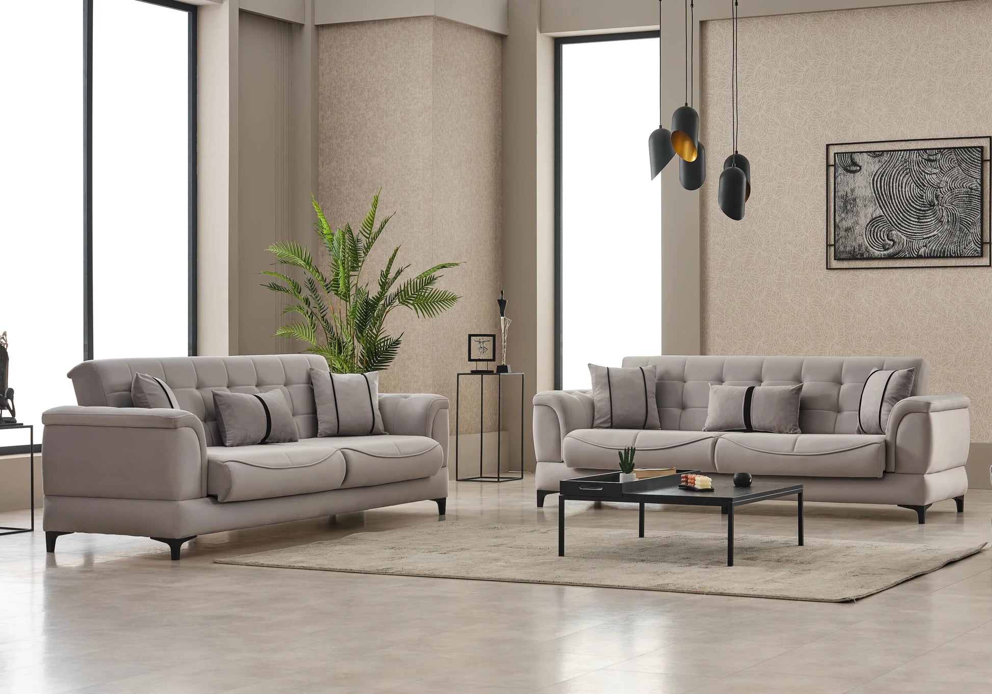 Offrez à votre intérieur un canapé qui mêle style et fonctionnalité. Le modèle DELTA en velours gris perle, au capitonnage raffiné et aux détails noirs contrastants, transforme chaque instant en moment de confort et d’élégance.